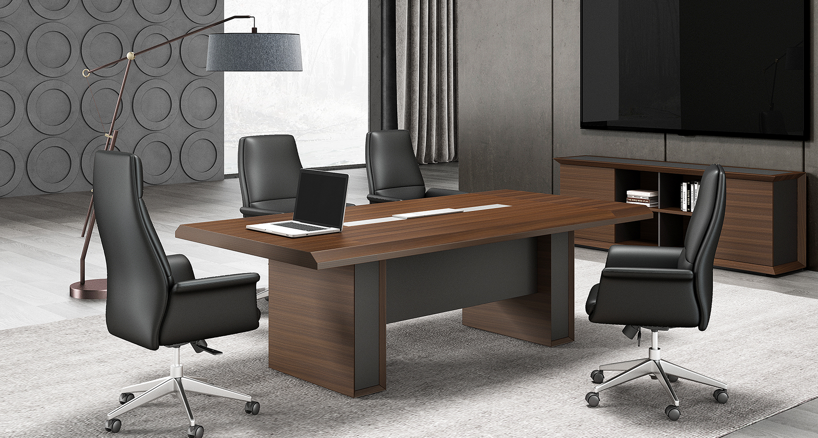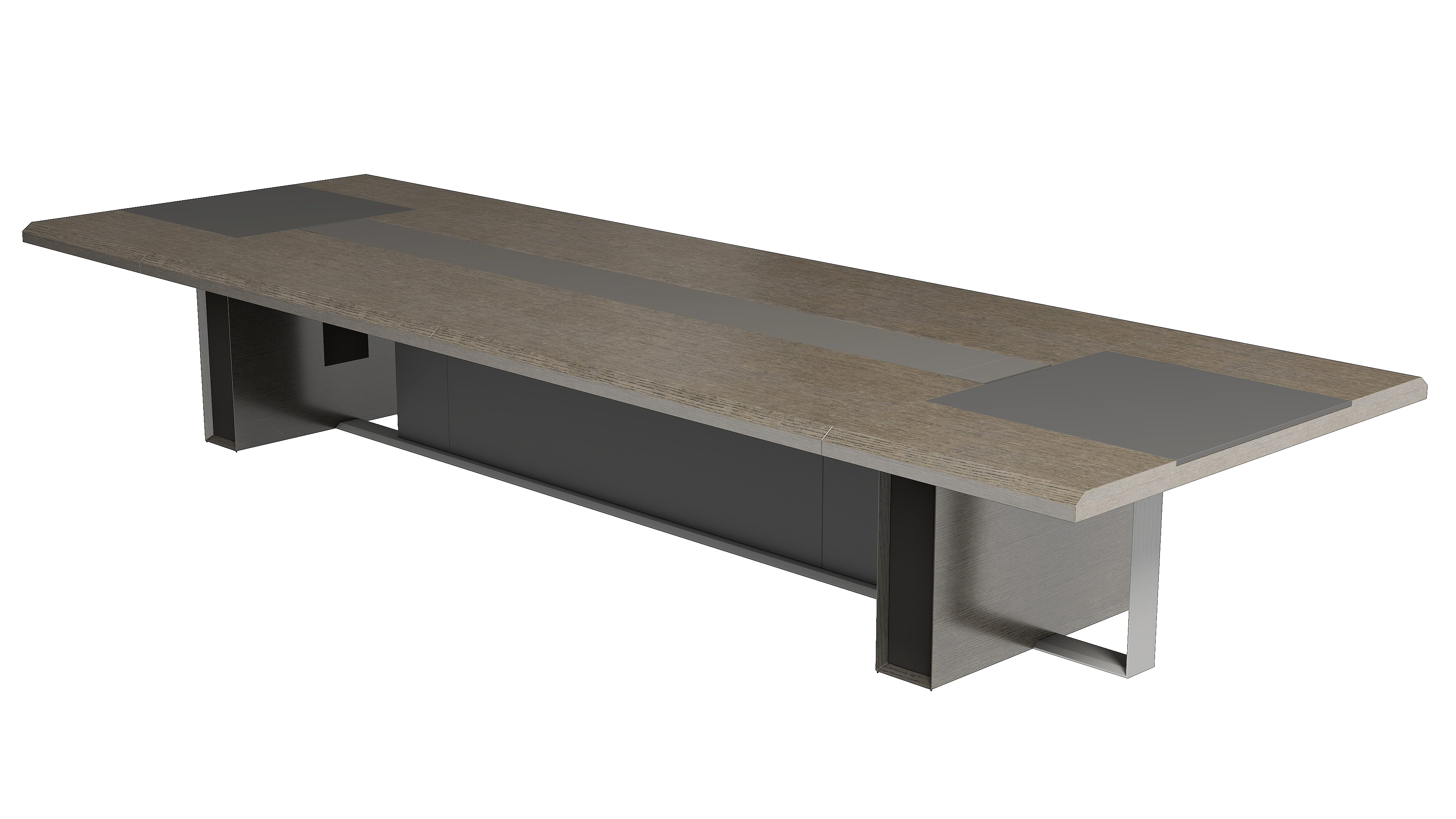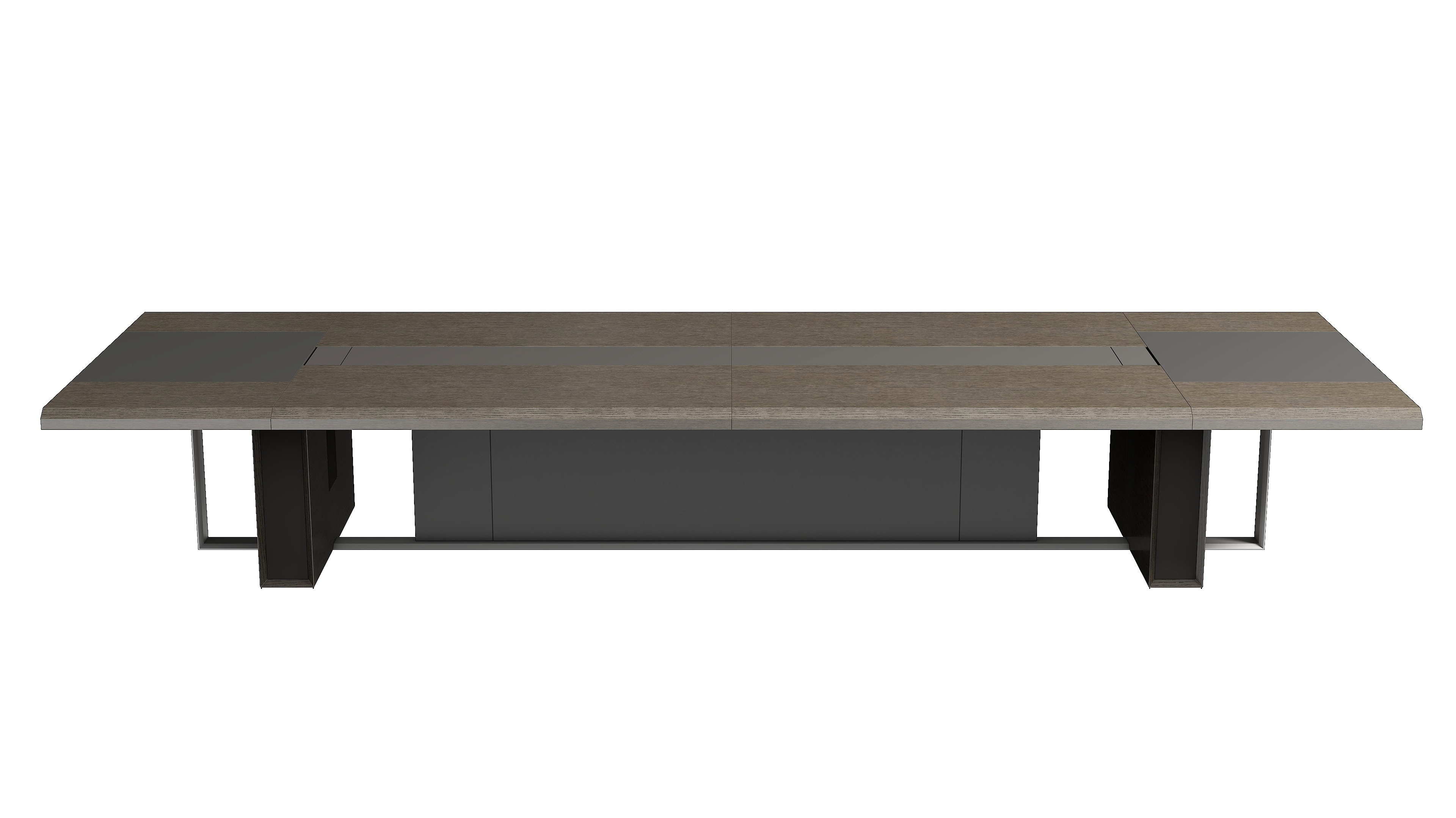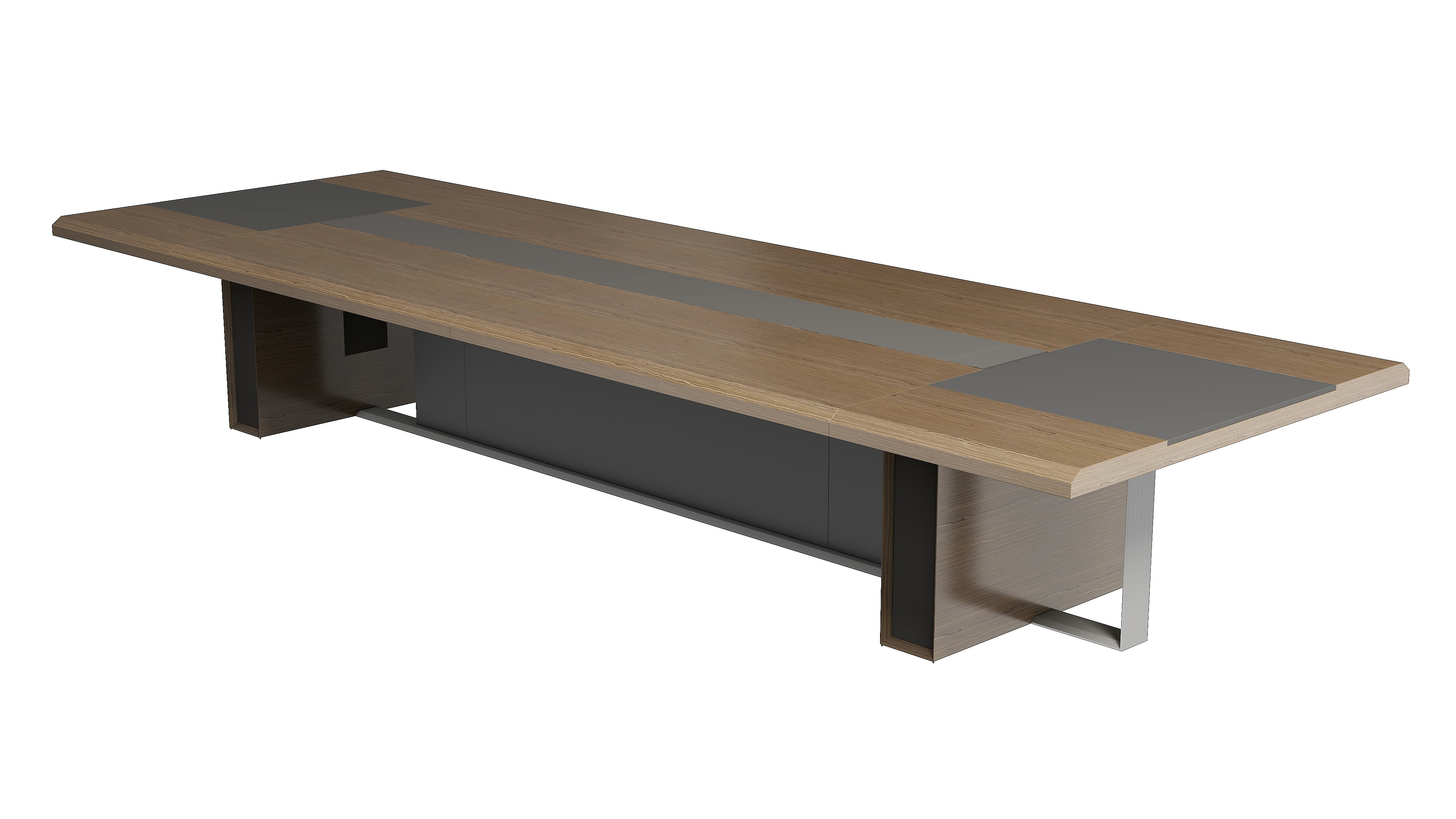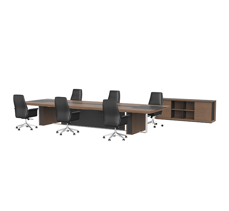 会议桌采用铝合金工艺支撑脚,柔和细腻,呈现出金属材质的独有质感和张力,台面简洁时尚的造型,兼顾了实用性与舒适性,独特的、人性化的结构,使用金属翻盖缓降线盒,内置多功能插座,也更利于保持工作环境的整洁,营造一个高端商务的办公空间。