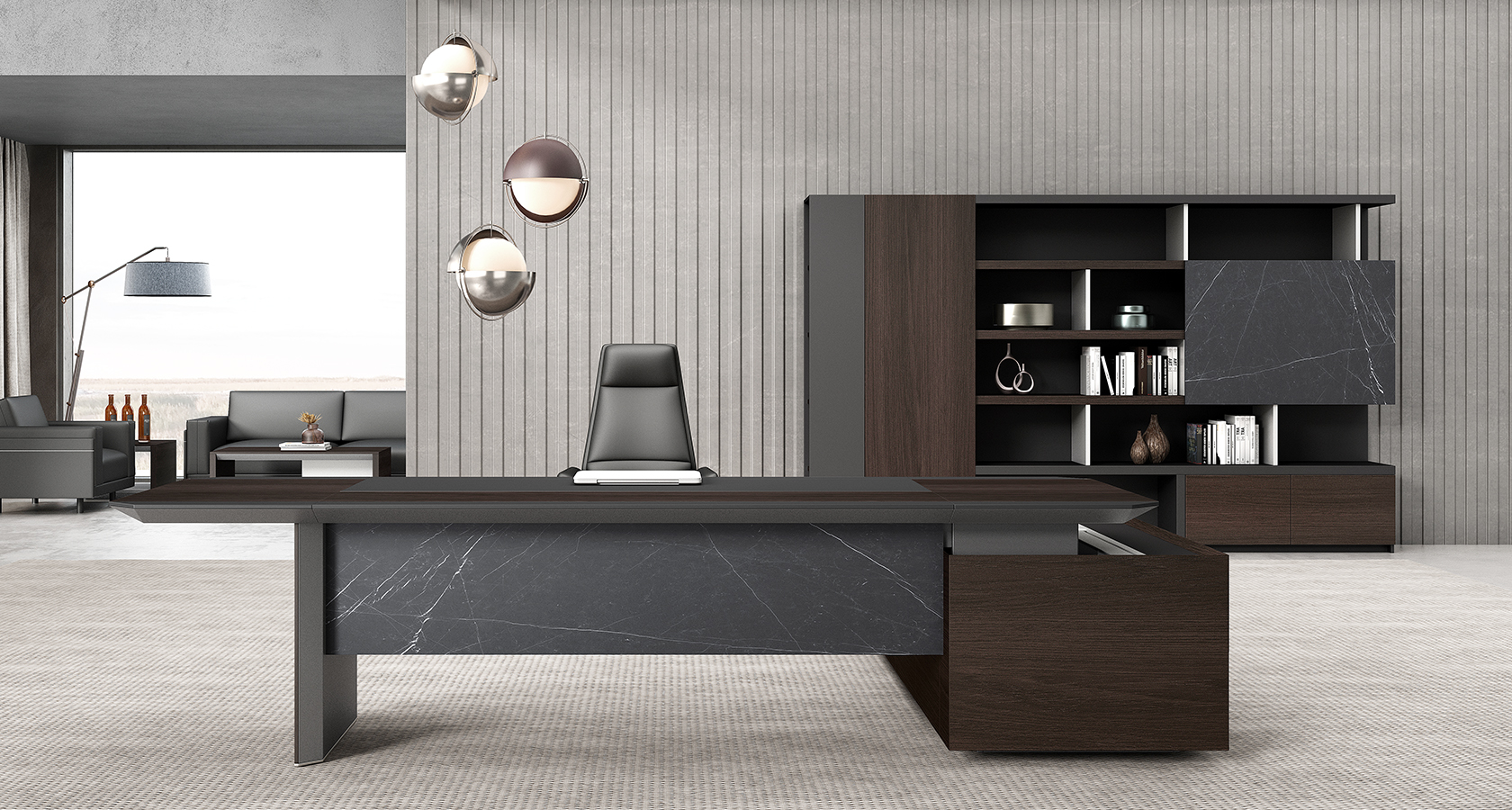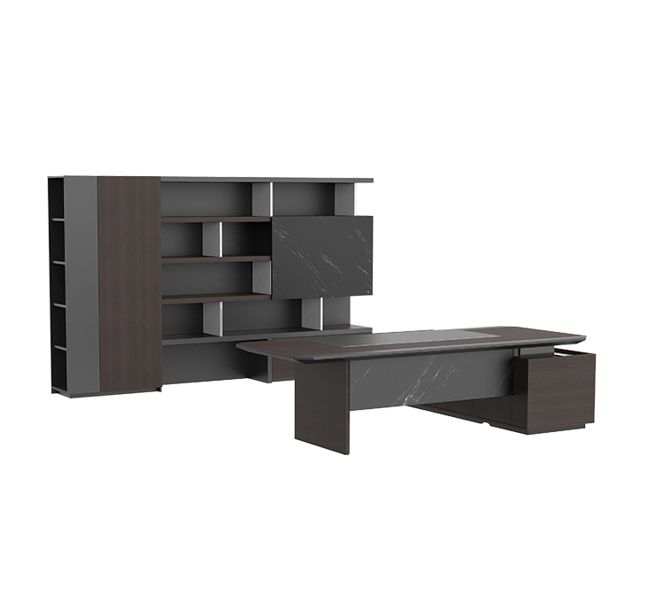 秉承致和求精的理念,同时风格上相比中性经典更加现代、简约、时尚,能够满足更加年轻化的用户群体的喜好,围合式侧板,防止小型物件的受到外力的影响时掉落,侧面顶板灵活运用翻盖无线充电线盒、铝型材的自有金属材质,在副台上进行了打破常规的贯穿式设计,兼融了视觉效果与手机、iPad的竖向收纳的需求,提升产品的功能与美感需求。配置了多功能翻盖线盒和无线充电模块,满足商务办公用电需求。