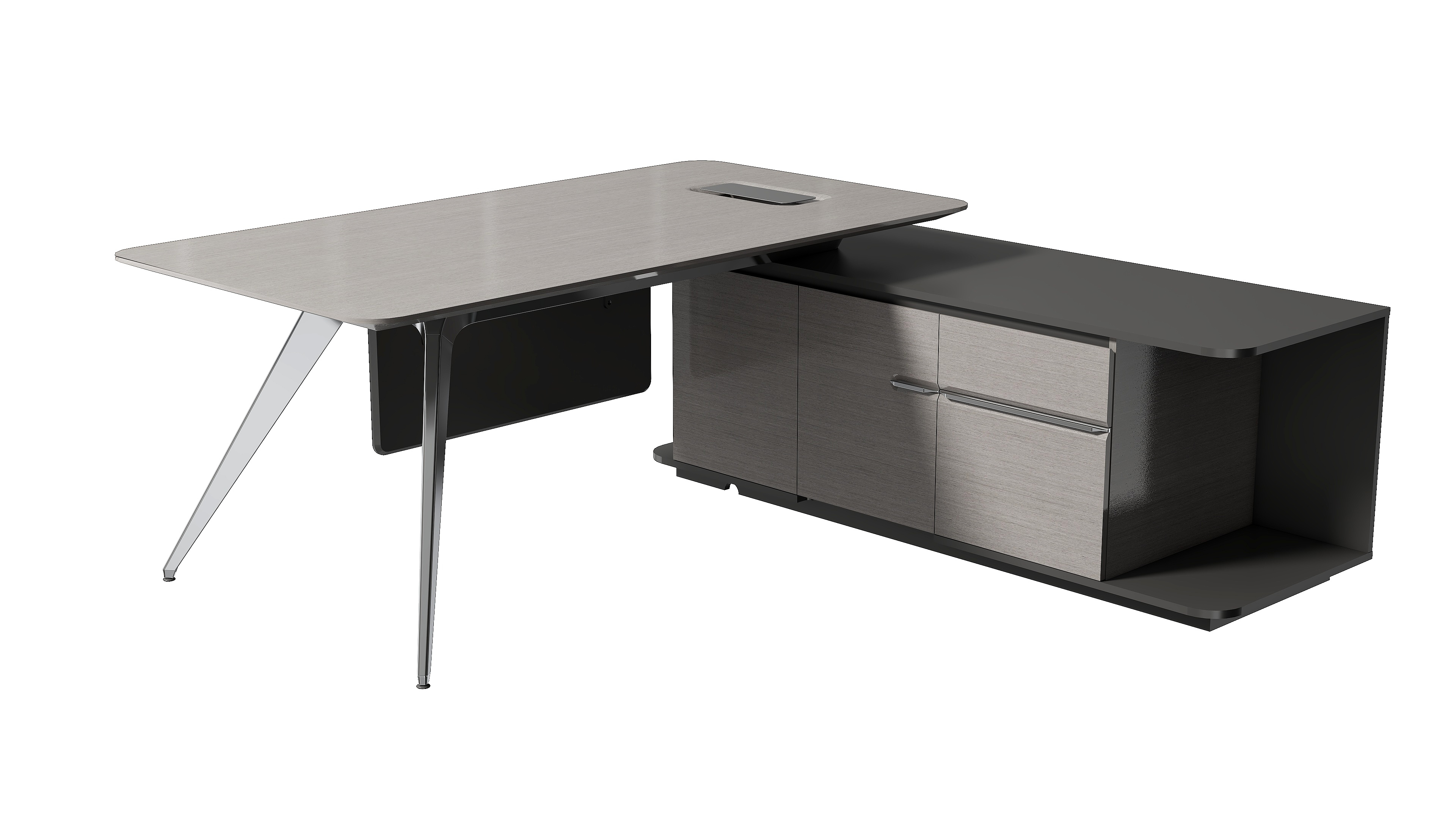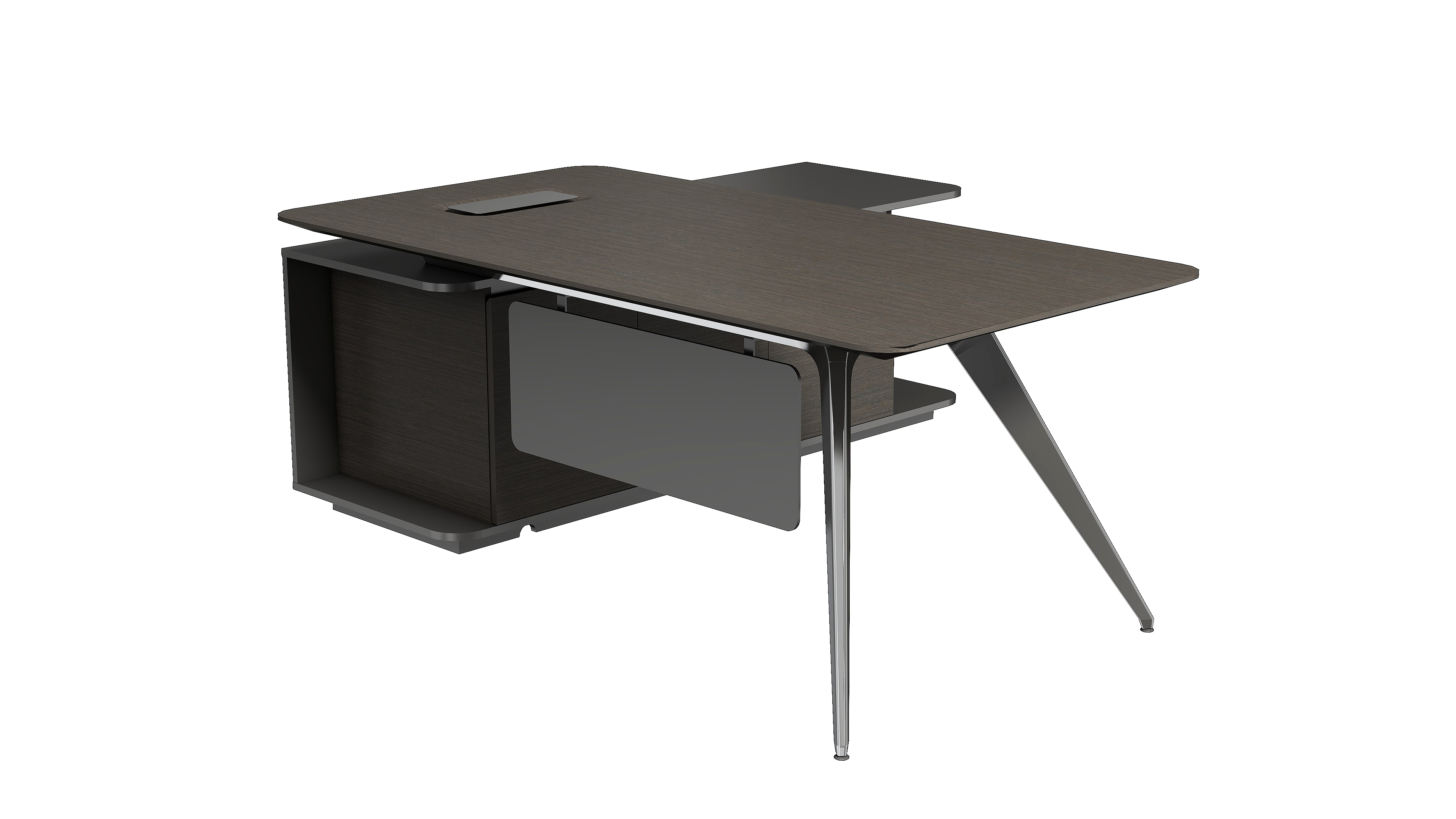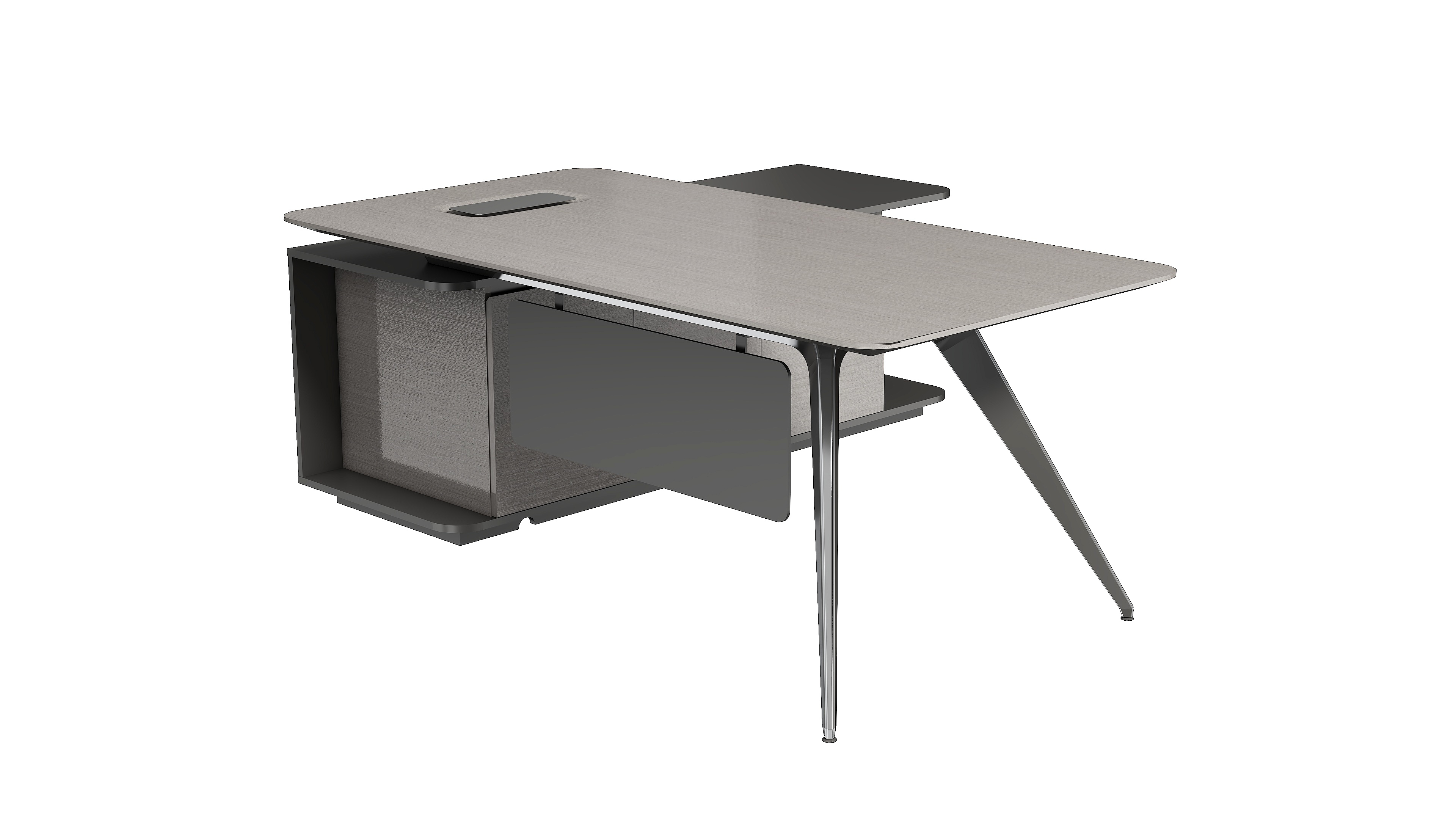 桌边设计呈现一种圆润柔和的线条感,透露出一种精致的美感和轻奢优雅的气质。干净利落的弧形钢脚设计使用高亮的抛光工艺,呈现金属材质独有的质感和张力。侧柜的开放收纳格提供包件便捷的临时收纳功能,使用时又能触手可得。在充分表达轻奢美感的同时传达刚柔并济的品质质感,彰显时尚、简约、大气的产品特色。