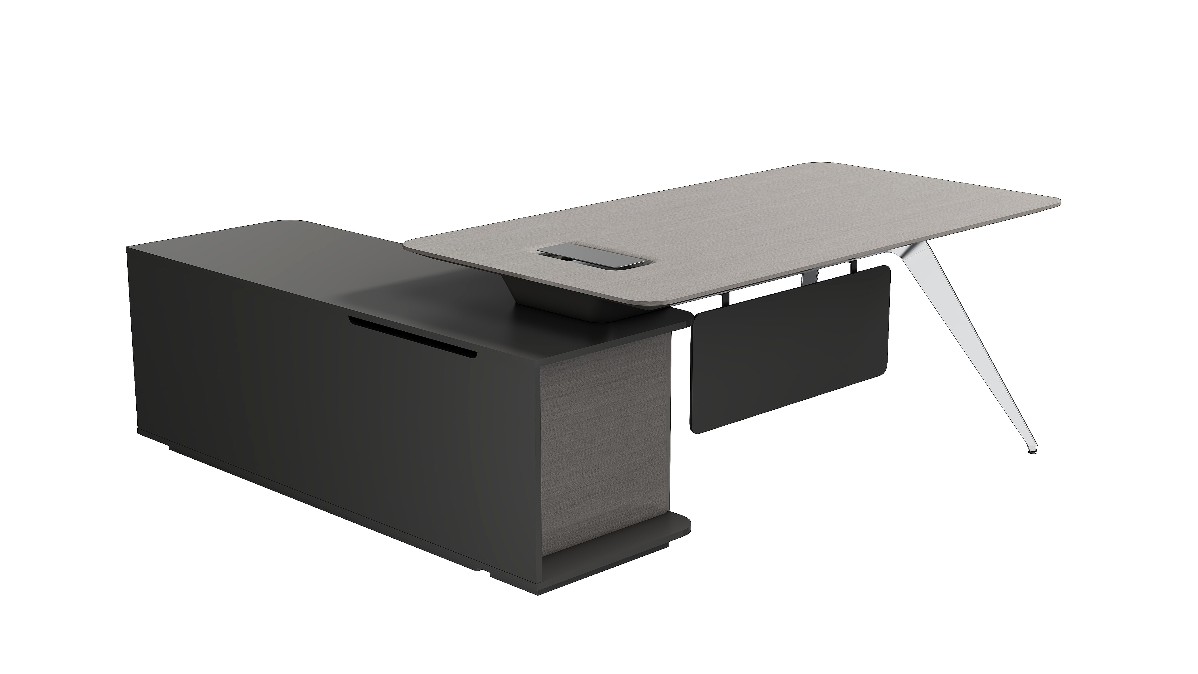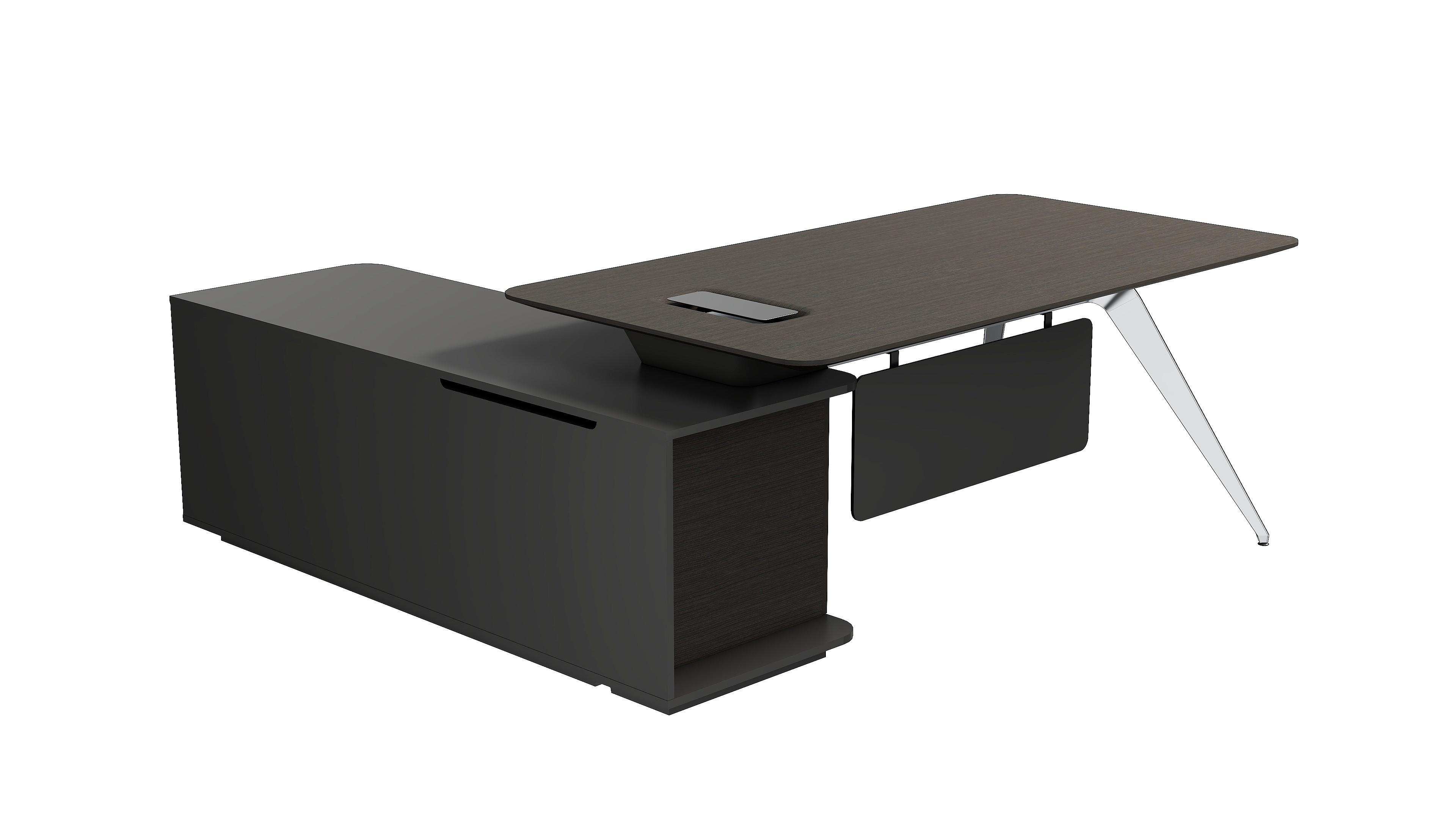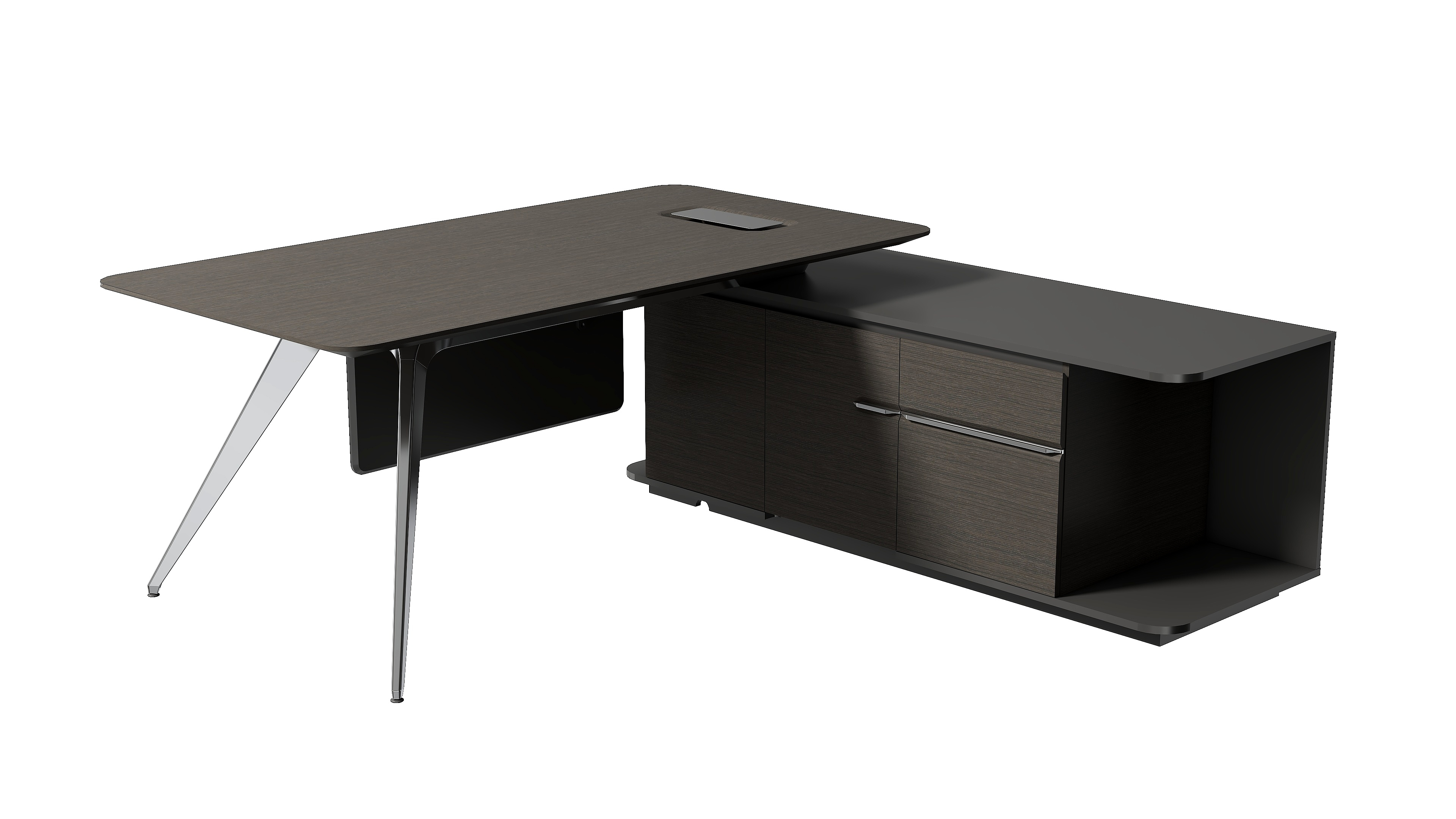 桌边设计呈现一种圆润柔和的线条感,透露出一种精致的美感和轻奢优雅的气质。干净利落的弧形钢脚设计使用高亮的抛光工艺,呈现金属材质独有的质感和张力。侧柜的开放收纳格提供包件便捷的临时收纳功能,使用时又能触手可得。在充分表达轻奢美感的同时传达刚柔并济的品质质感,彰显时尚、简约、大气的产品特色。